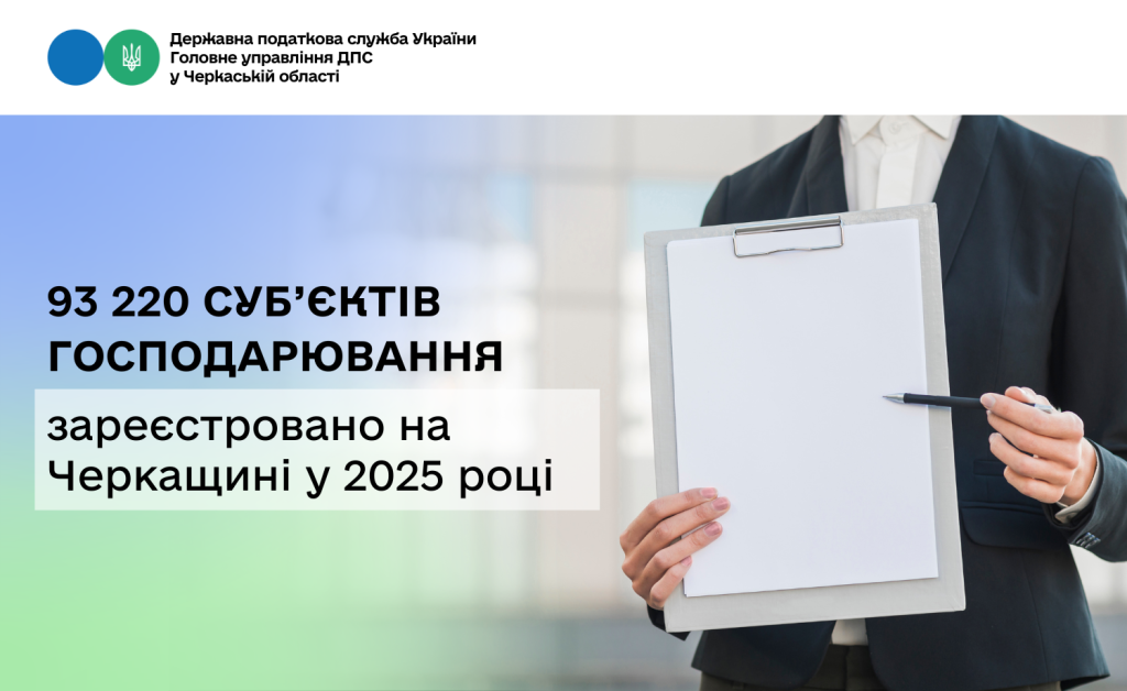 Головне управління ДПС у Черкаській області інформує, що протягом 2025 року на Черкащині зареєстровано 93 220 суб’єктів господарювання, із них: 59 470 фізичних осіб-підприємців та 33 750 юридичних осіб.