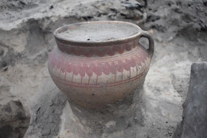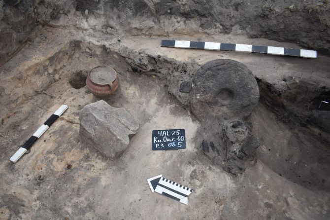 Усередині споруди, на рівні підлоги, знайдено цілий керамічний горщик, у якому зберігалися уламки іншого, а також камінь і кам’яне жорно. Посуд прикрашений мальованим орнаментом і є типовим для побуту XVIII століття. Жорно виготовлене з кристалічної кам’яної породи, має круглу форму з отвором у центрі та сліди інтенсивного використання.