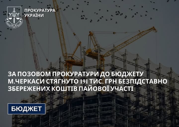 Рішенням Господарського суду Черкаської області задоволено позов прокурора та стягнуто з підприємства-забудовника на користь Черкаської міської ради 191 тис. грн безпідставно збережених коштів пайової участі у розвитку інфраструктури міста Черкаси.
