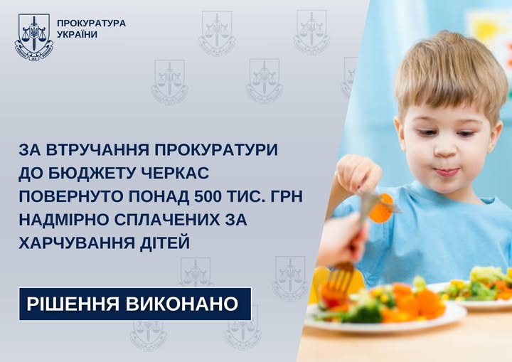 Черкаською окружною прокуратурою в межах вжиття заходів, спрямованих на забезпечення реального виконання судових рішень у сфері захисту інтересів дітей, забезпечено стягнення з місцевого товариства понад 500 тис. грн до бюджету Черкаської міської територіальної громади.