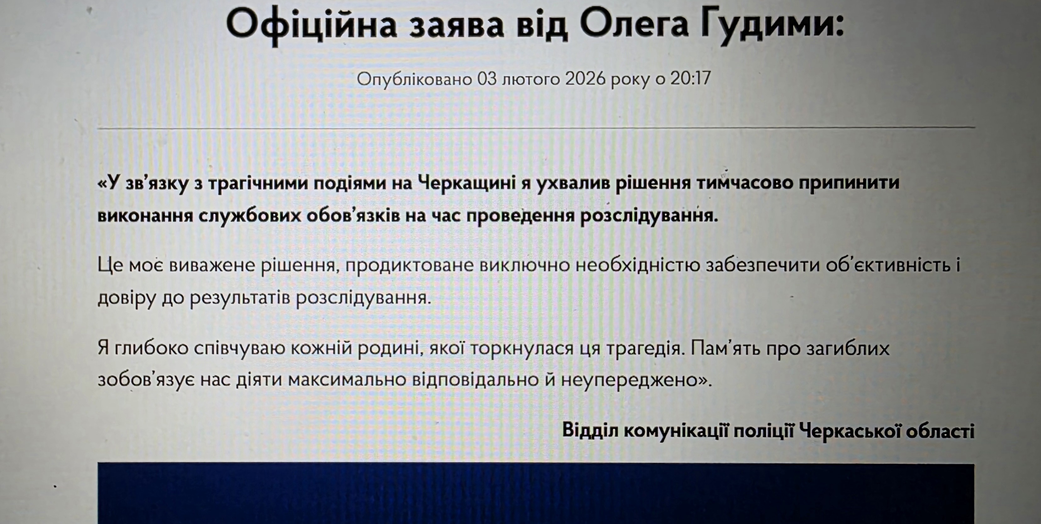 «У зв’язку з трагічними подіями на Черкащині я ухвалив рішення тимчасово припинити виконання службових обов’язків на час проведення розслідування.