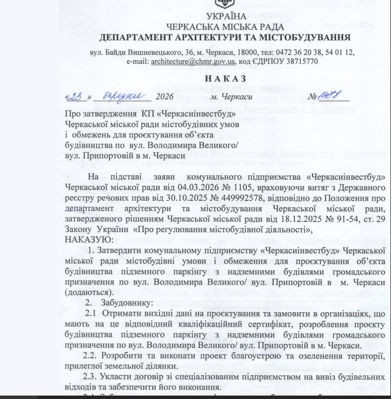 Відповідний дозвіл надав департамент архітектури та містобудування Черкаської міської ради КП «Черкасиінвестбуд», пише «Вікка».