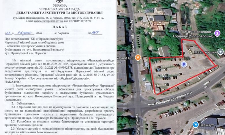 У Черкасах на місці автомобільної стоянки, що на розі вулиць Припортова та Володимира Великого, планують збудувати підземний паркінг із надземними будівлями.