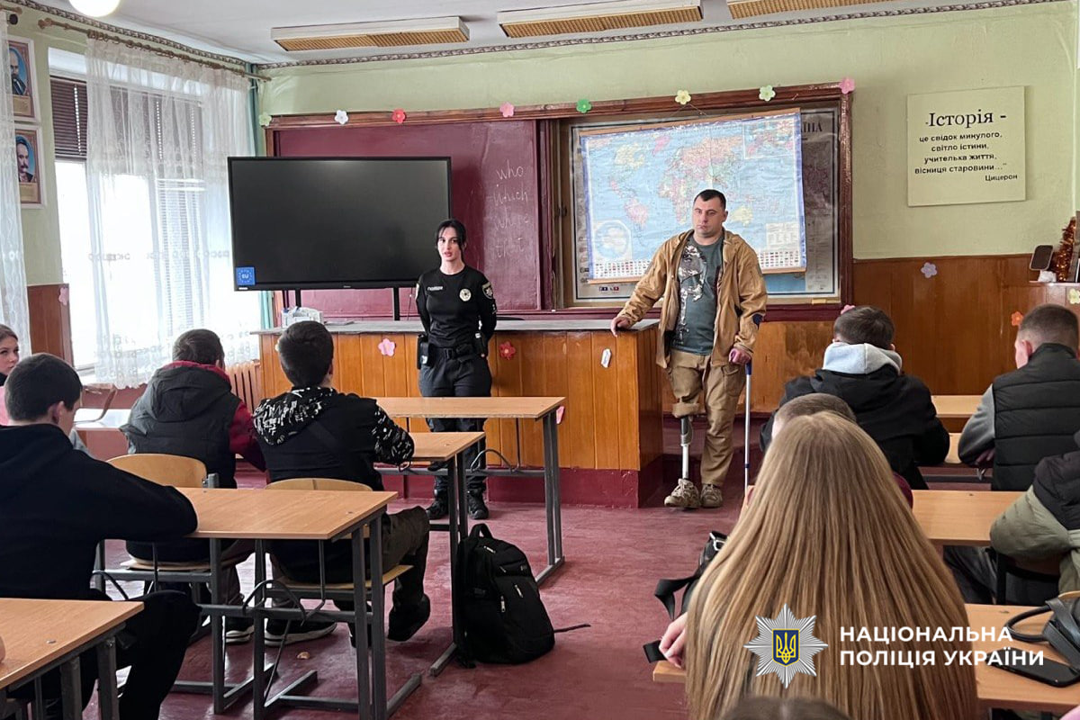 Поліцейські Служби освітньої безпеки Золотоніського райвідділу поліції провели зустріч із ветераном для учнів Гельмязівського опорного закладу загальної середньої освіти.