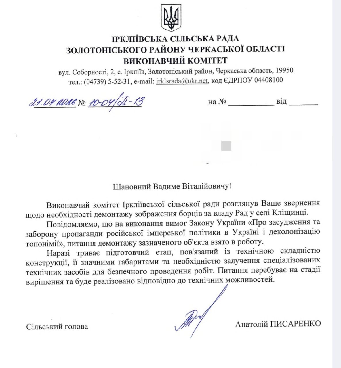 Виконавчий комітет Іркліївської сільської ради розглянув звернення щодо необхідності демонтажу зображення "борців за владу рад" у селі Кліщинці.