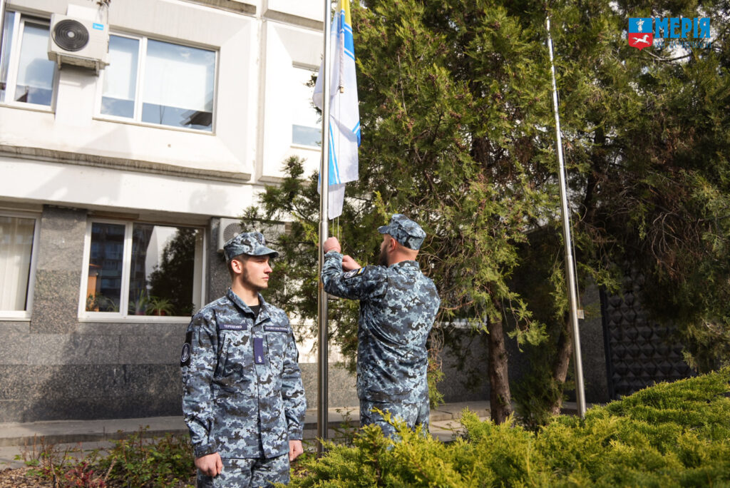 Право підняти прапор Військово-Морських Сил Збройних Сил України було надано старшині 1 статті, командиру групи артилерійських катерів Максиму Колеснику. Під звуки Державного Гімну України синьо-жовтий стяг урочисто підняли над містом.