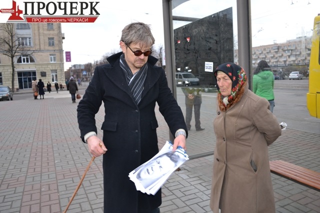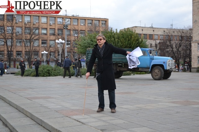 Сьогодні черкаський художник, учасник арт-групи «Ганг-Дон» Олександр Дувінський влаштував на Соборній площі перфоманс. Представившись інвалідом середнього та головного мозку, він пропонував черкащанам допомогти повісити на каркас ялинки фотографію Президента України Віктора Януковича.