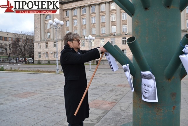 Втім черкащани до акції так і не приєдналися, тож митцеві довелося чіпляти фото Януковича на ялинку власноруч. Пенсіонерка, що саме стояла на зупинці, вигукнула, що фото Президента слід «чіпляти лише в туалеті».