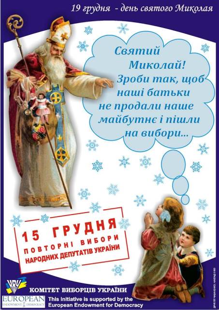 Три мобільні групи волонтерів Черкаської обласної організації Комітету виборців України розклеїли плакати в Черкаському, Канівському та Золотоніському районі із закликом до виборців прийти на дільниці 15 грудня, щоб проголосувати, йдеться на сайті КВУ.