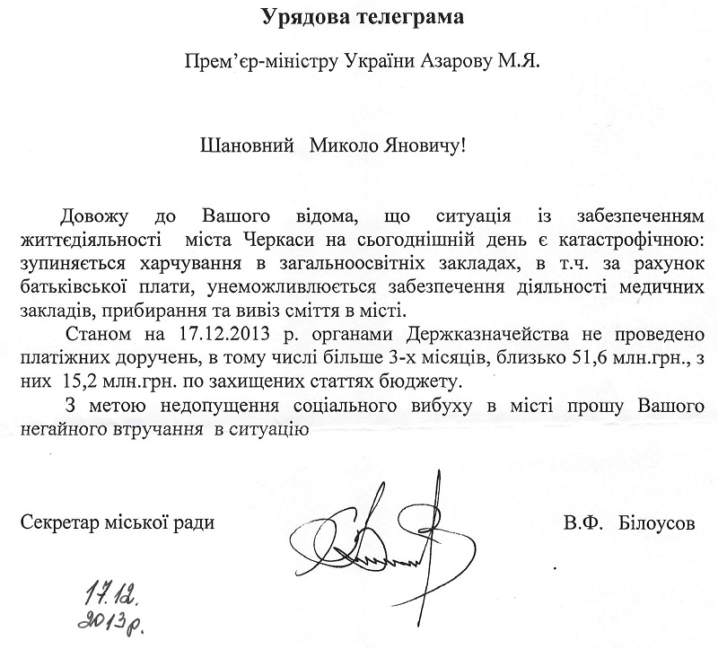 Виконуючий обов’язки міського голови, секретар Черкаської міської ради Віктор Білоусов звернувся терміновою телеграмою до Прем’єр-міністра України Миколи Азарова з проханням негайно втрутитись у ситуацію та звернути увагу на проблему, яка існує у місті. Про це Віктор Білоусов повідомив в коментарі «Прочерку», обґрунтовуючи необхідність проведення сесії.