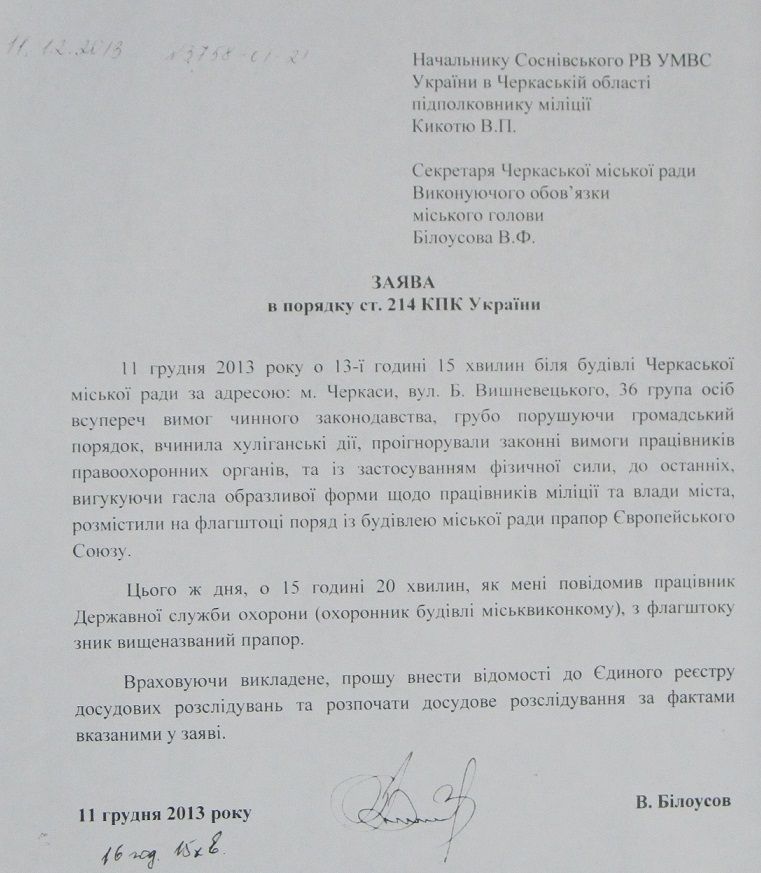 Виконуючий обов’язки міського голови Черкас, секретар міськради Віктор Білоусов звернувся до правоохоронців з проханням уважніше поставитися до розслідування справи, пов’язаної з порушенням громадського порядку, що мав місце 11 грудня перед міськрадою, коли група депутатів і громадськість підняли на щоглі прапор ЄС. Про це Віктор Білоусов повідомив у коментарі «Прочерку».
