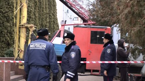 Перед будівлею прокуратури стоять кілька вантажівок нібито для ремонту приміщення, і натягнута червоно-біла попереджувальна стрічка.
