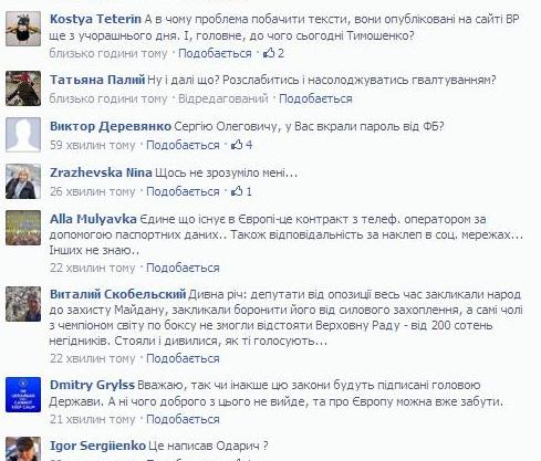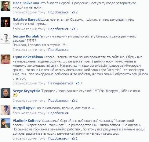 Крім того, деякі дописувачі сприйняли пост Одарича як підтримку ухваленим учора законам та навіть засумнівалися, чи не вкрали в нього пароль від «Фейсбуку».