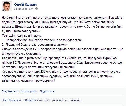 «Не бачу нічого трагічного в тому, що вчора стало називатися законом. Більшість подібних норм в тому чи тому вигляді існує в більшості демократичних держав. Щодо механізмів реалізаціі – говорити не можу, бо не бачив текстів (як і ті, що нібито голосували)», – зазначив Сергій Одарич.