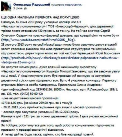 «На той час екс-мер Сергій Одарич на прес-конференції доводив, що кращої ціни не може бути. 28 лютого 2013 року на сесії міської ради мною було озвучено депутатський запит стосовно відносин між цією приватною структурою та комунальним підприємством, директором, якого на той час був Юрій Чернецький. Як депутат міської ради дуже вдячний нинішньому директору «Черкаситеплокомуненерго» Миколі Кушніру за те, що він звернув увагу на ці події.