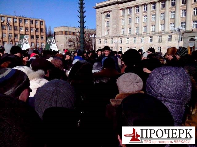 Їх туди закликав іти депутат Черкаської міськради від «ВО «Батьківщина» Микола Булатецький. Головною вимогою мітингувальників є звільнення затриманих цієї ночі під час штурму ОДА. Люди проголошують гасла «Черкаси, вставай!», а також «Банду геть!». Виступаючи перед черкащанами, Булатецький зазначив, що «діти – невинні, тож їх треба визволяти».