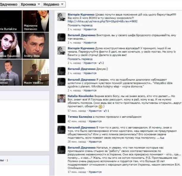 «Мене вражає ІДІОТИЗМ місцевої громадської та політичної еліти, які «тащаться» від цього бардаку? Більш того ще намагаються стати активними учасниками! Чого? Як наша країна повторить подвиг Югославії? Саме ви штовхаєте народ до громадянської війни! Саме на вас лежить відповідальність за життя, каліцтва і розруху. Ви зрадили свою країну! Ви зрадили свій народ! Вам ніхто і ніколи цього не пробачить! Будете горіти в пеклі кидаючи одне одного «коктейлі Молотова»!» – впевнений Віталій Дядченко.