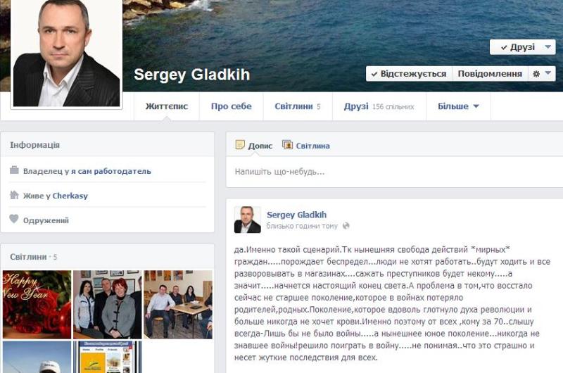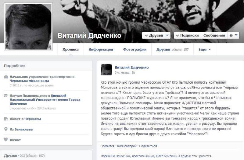 На своїй сторінці у «Фейсбук» депутат Черкаської міської ради з Партії регіонів Віталій Дядченко роздумує над тим, хто цієї ночі «штурмував» приміщення обласної державної адміністрації.