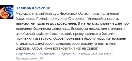 Наразі в Апеляційному суді Черкаської області триває судове засідання щодо зміни запобіжного заходу одному з лідерів Автомайдану Сергію Хаджинову. Присутні прокурор, 4 адвокати підозрюваного і сам підозрюваний, якого доставили з СІЗО. У залі суду присутні депутати, журналісти, активісти майдану, пересічні черкащани. У залі багато людей, оскільки особистість Хаджинова є відомою. Про це інформує кореспондент "Прочерку" з зали суду.