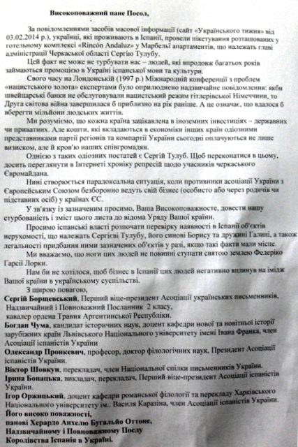 Шестеро українців, які займаються промоцією іспанської мови та культури в нашій країні, звернулися до Посла Королівства Іспанії в Україні Херардо Анхеля Бугальйо Оттоне з проханням перевірити, чи справді голова Черкаської ОДА Сергій Тулуб має маєтки в Іспанії. Звернення «іспаністів» озвучив під час сьогоднішньої прес-конференції народний депутат України Леонід Даценко.