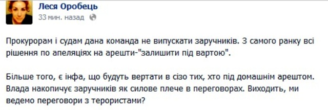 Прокурорам і судам дали команду не випускати заручників-активістів, яких звинувачують в організації масових заворушень. Про це на свої сторінці в соціальній мережі «Фейсбук» написала народний депутат Леся Оробець.