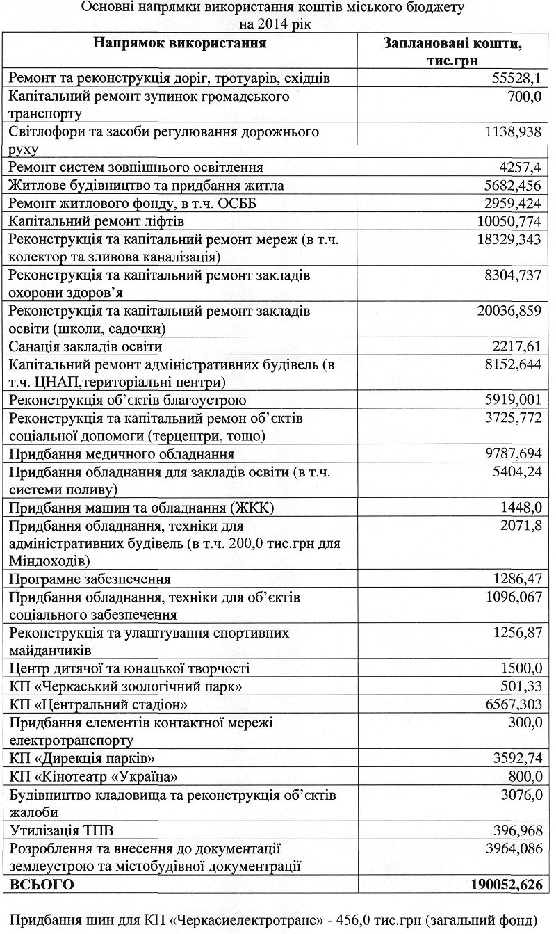 Заходи Програми узгоджені з бюджетом м. Черкаси на 2014 рік та фінансуються за рахунок коштів міського бюджету, субвенцій з обласного та державного бюджетів, коштів підприємств та інвесторів, зазначають у прес-службі Черкаського міськвиконкому.