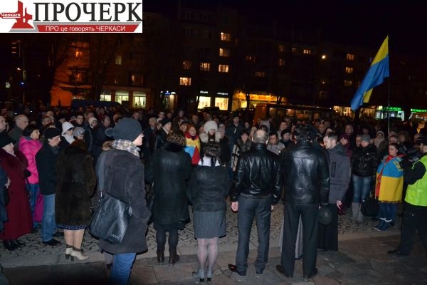 Сьогодні в Черкасах на площі ім. Тараса Шевченка відбувся «позаплановий» мітинг. Попри домовленість євромайданівців збиратися лише двічі на тиждень – у середу та суботу – події в Києві не змогли залишити байдужими черкащанам, тож вони за кілька годин домовилися вийти на зібрання.