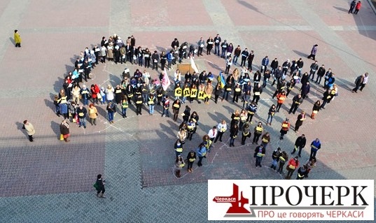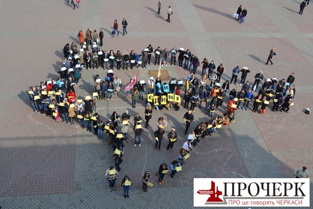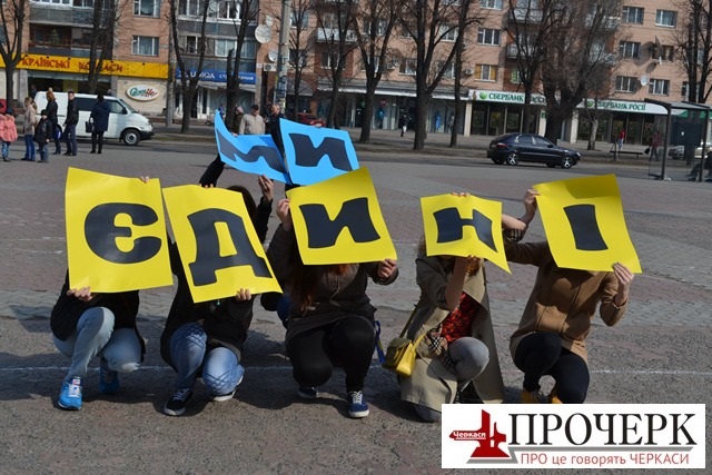 Кілька десятків черкащан своїми тілами створили карту України та Криму. В руках молодь тримала жовті та блакитні аркуші паперу, а також букви, що складали гасло «Ми єдині».