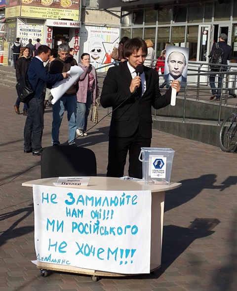 Щойно в Черкасах на площі поряд із Будинком торгівлі представники партії «Демократичний альянс» влаштували імпровізовану прес-конференцію Президента Російської Федерації Володимира Путіна, якого представили як «головного окупанта України Путлера».