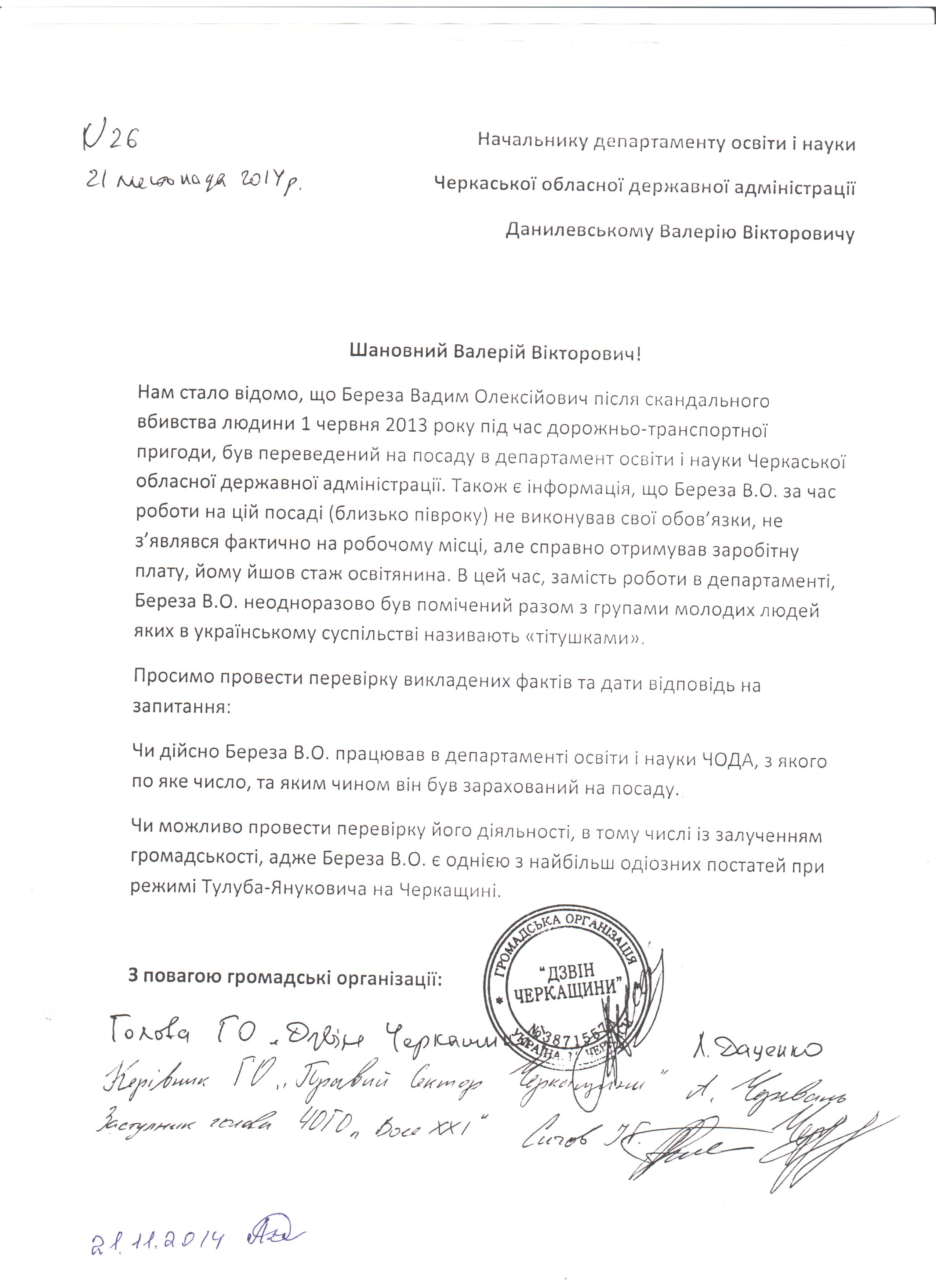 “Нам стало відомо, що Береза Вадим Олексійович після скандального вбивства людини 1 червня 2013 року під час дорожньо-транспортної пригоди, був переведений на посаду в департамент освіти і науки Черкаської обласної державної адміністрації. Також є інформація, що Береза В.О. за час роботи на цій посаді (близько півроку) не виконував свої обов’язки, не з’являвся фактично на робочому місці, але справно отримував заробітну плату, йому йшов стаж освітянина. В цей час, замість роботи в департаменті, Береза В.О. неодноразово був помічений разом з групами молодих людей, яких в українському суспільстві називають “тітушками”, – йдеться в зверненні, адресованому начальнику Департаменту освіти і науки Черкаської ОДА Валерію Данилевському.