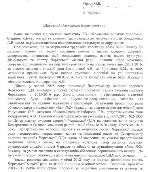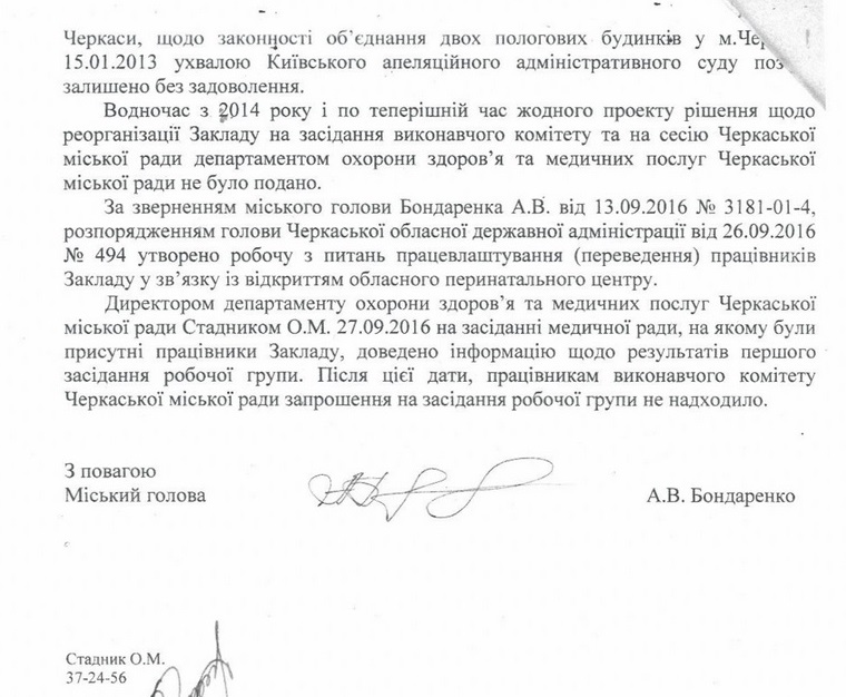Ініціативній групі трудового колективу Комунального Закладу «Черкаський міський пологовий будинок «Центр матері та дитини» бази №2 надійшла відповідь від міського голови Черкас Анатолія Бондаренка, підготовлена директором департаменту охорони здоров’я Черкаської міської ради Олегом Стадником.