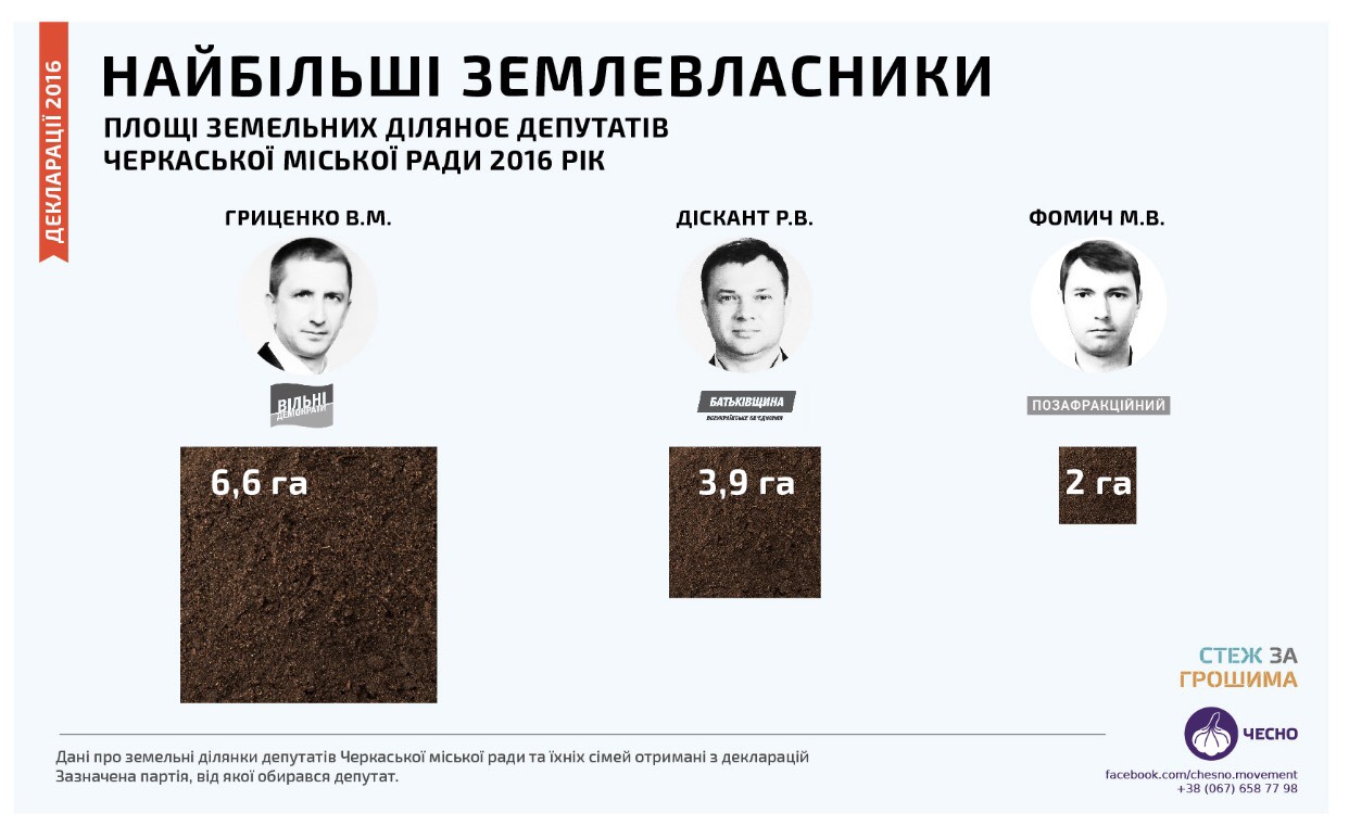 Найбільше землі належить депутату з фракції “Партія вільних демократів” (правонаступниця партії “Яблуко”, лідер якої Михайло Бродський) Володимиру Гриценку.