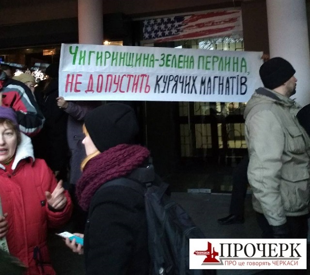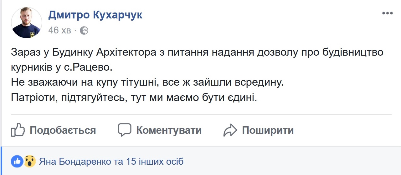 Біля приміщення присутні багато людей. Ті, хто за будівництво, і, ті хто проти. Зокрема, ті хто підтримують будівництво курників у Рацевому пояснюють, що приїхали, аби стежити за порядком і не пустити противників.