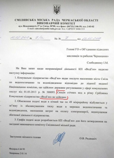 Відповідь виконавчого комітету щодо забруднення річки Тясмин очисними спорудами ВодГео