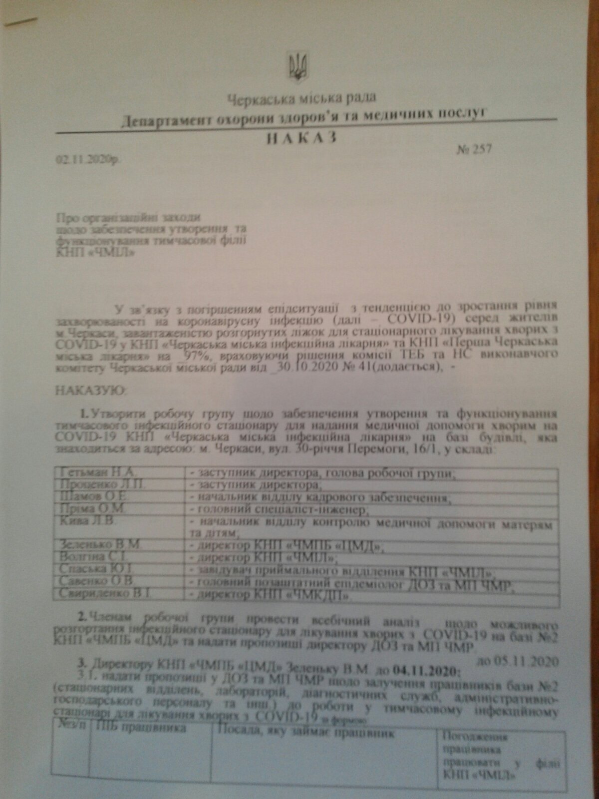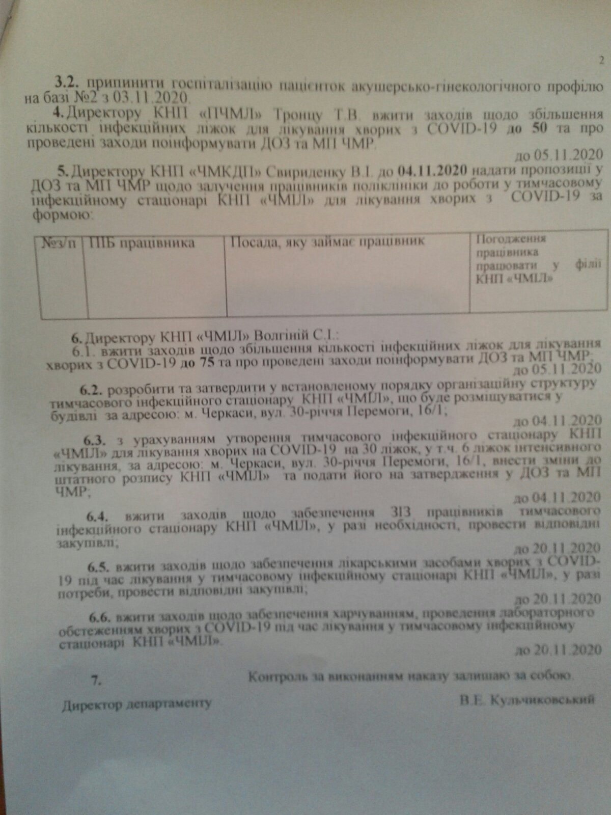 Про це йдеться у відповідному наказі департаменту охорони здоров’я та медичних послуг ЧМР. Його копію виданню "Прочерк" надали лікарі закладу.