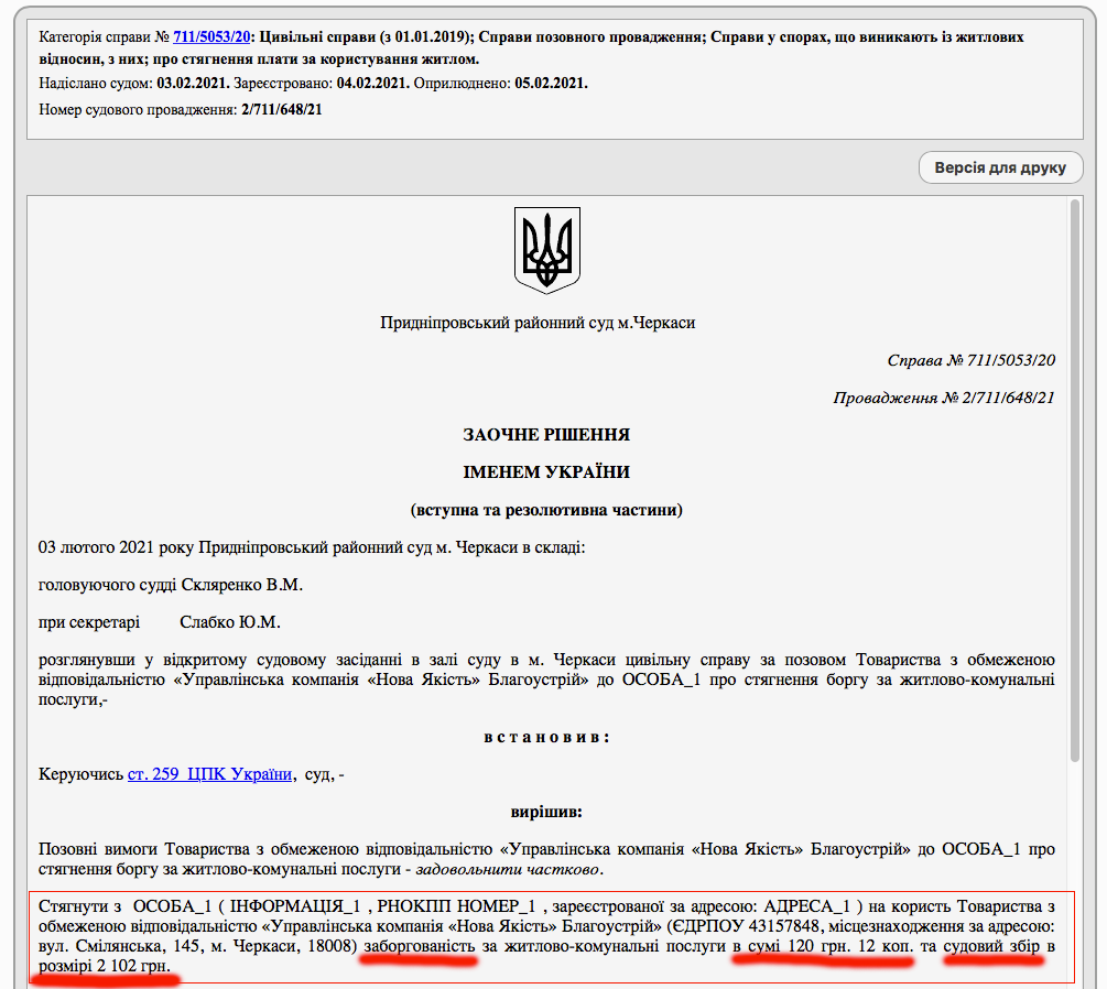 Черкаський суд виніс уже перші шість рішень стосовно черкащан, які заборгували за вивезення великогабаритних та ремонтних відходів компанії «Нова якість «Благоустрій». Замість лише кількох сотень боргу мешканці змушені будуть сплатити ще й 2102 гривні судового збору. І це без 1-2 тисяч гривень адвокатських витрат, які компанія наразі не заявляла.