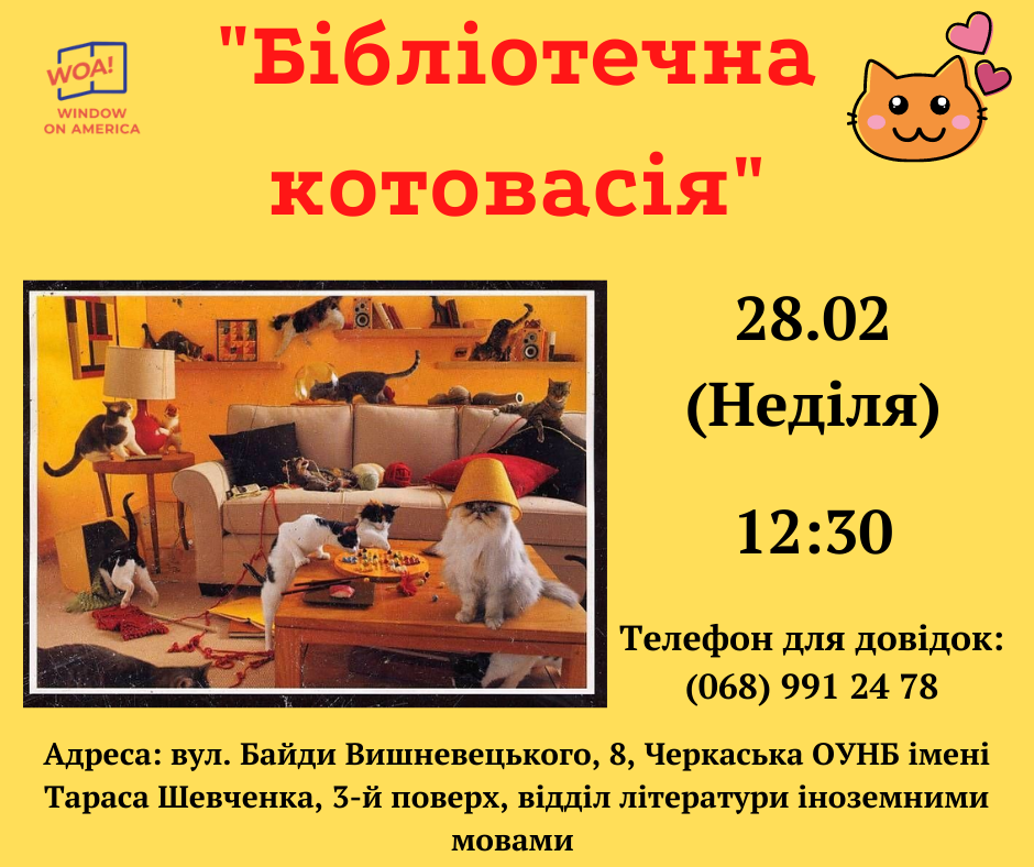28.02. о 12:30 в черкаській бібліотеці імені Тараса Шевченка відбудеться неймовірний котячий захід «Бібліотечна котовасія» вітаємо!