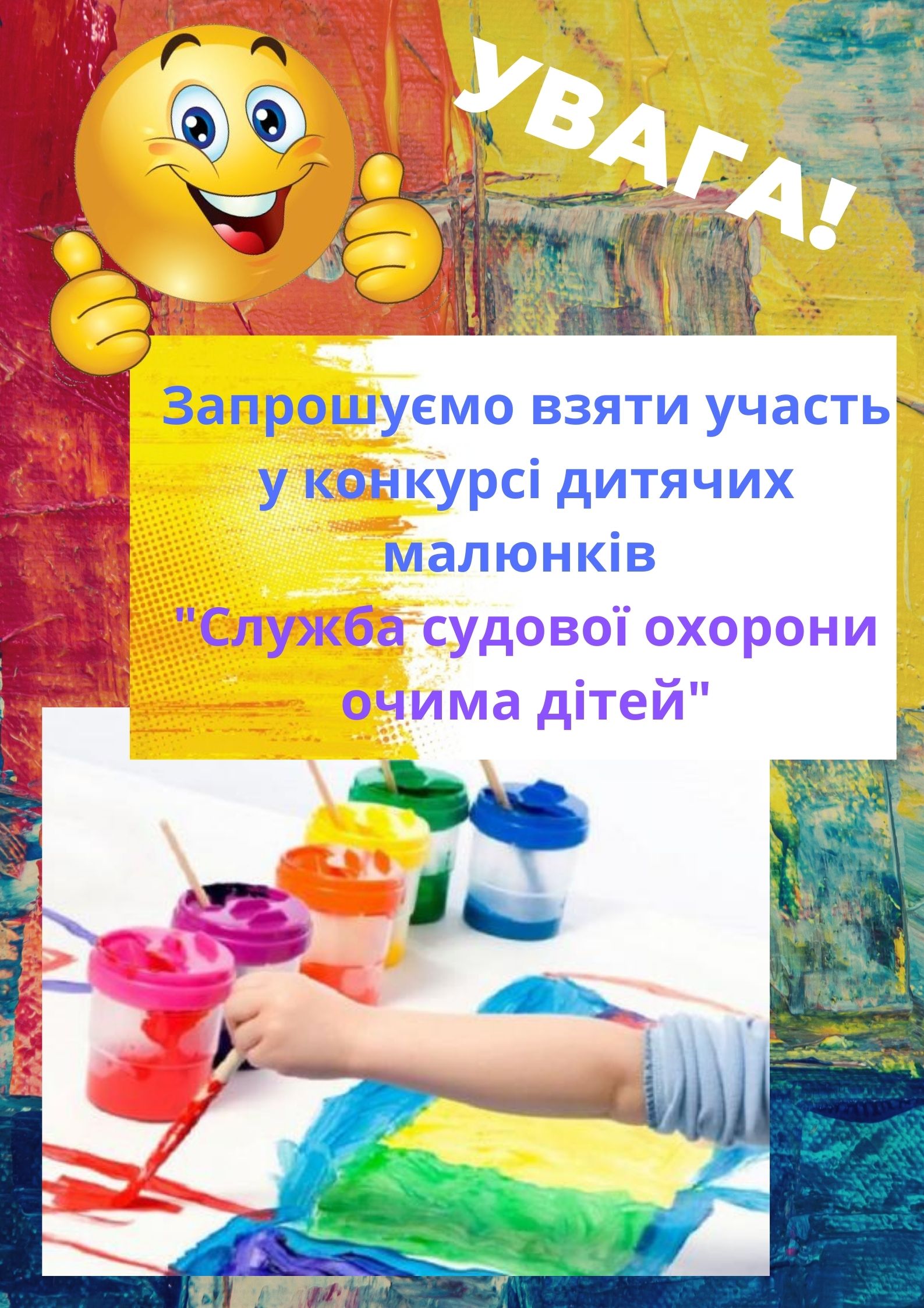2 квітня 2021 року в приміщеннях Територіального управління Служби судової охорони у Черкаській області, Територіального управління Державної судової адміністрації України у Черкаській області та судових установах області, які перебувають під охороною Служби судової охорони, буде організовано виставку учасників конкурсу дитячих малюнків «Служба судової охорони очима дітей».