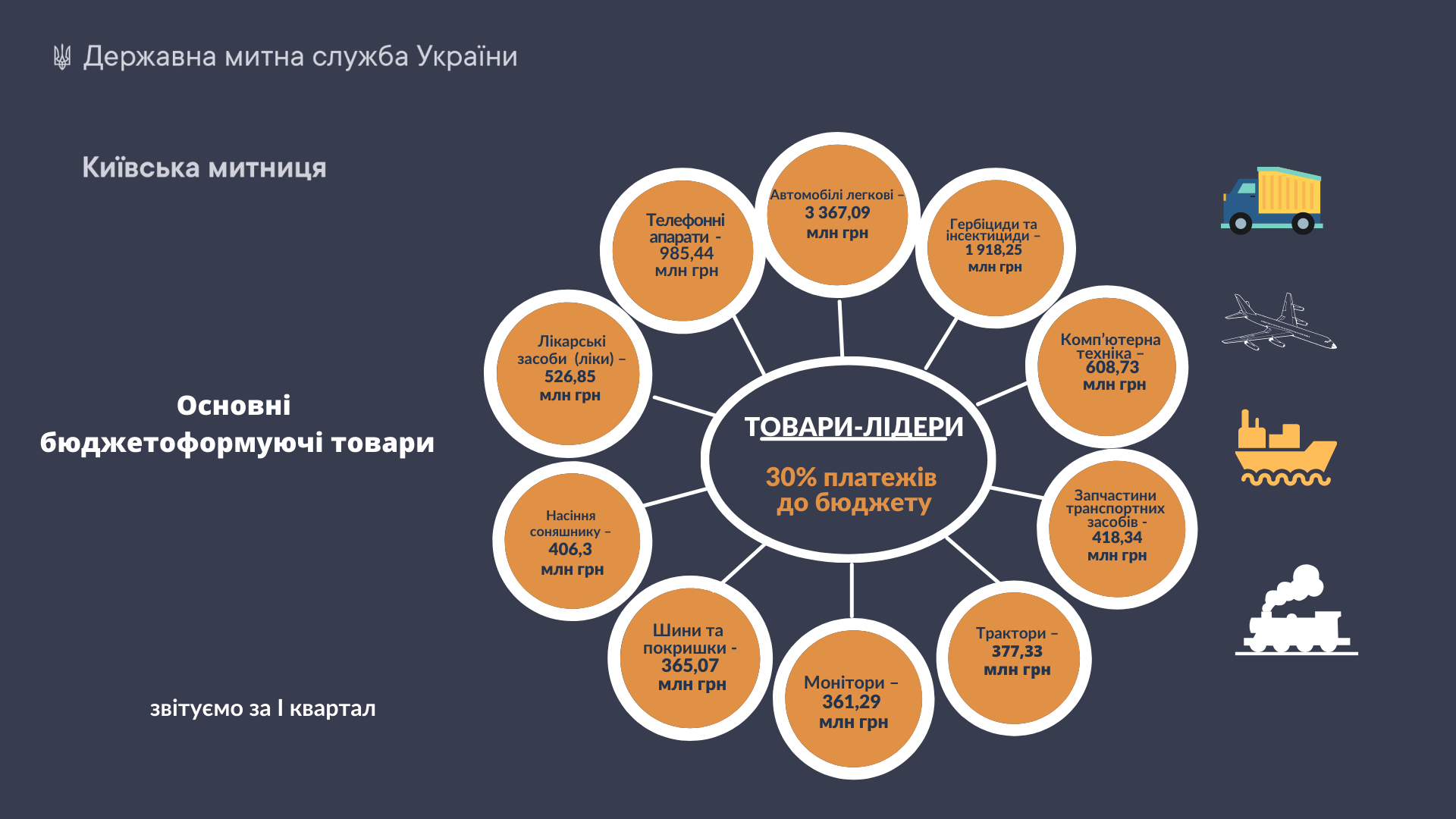Загалом же митні платежі при імпорті товарів-лідерів склали 30% всіх надходжень до бюджету по Київській митниці у першому кварталі.