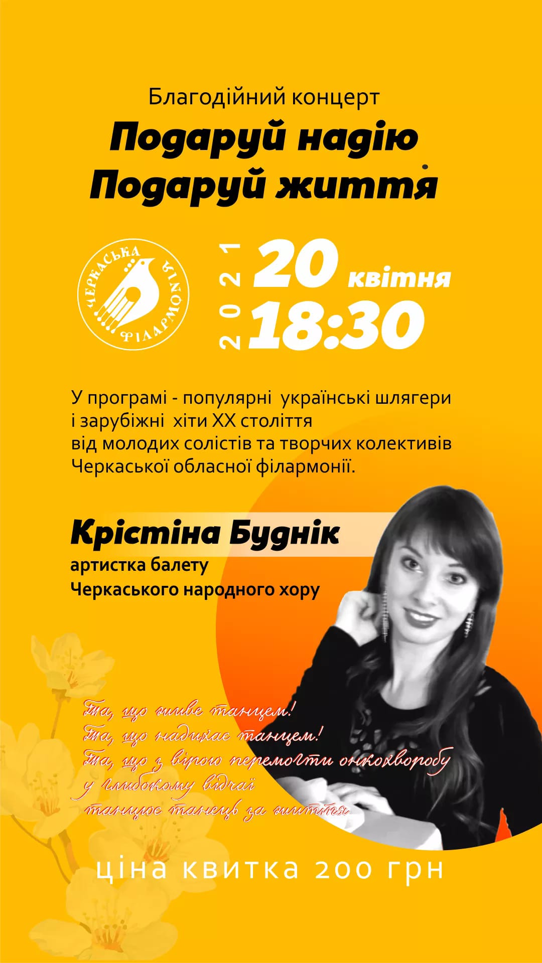 Концерт, що відбудеться 20 квітня 2021 р. о 18.30 у Черкаській обласній філармонії, - наш з Вами шанс допомогти молодій артистці балету Черкаського народного хору Крістіні Буднік вилікуватися і перемогти підступну хворобу.