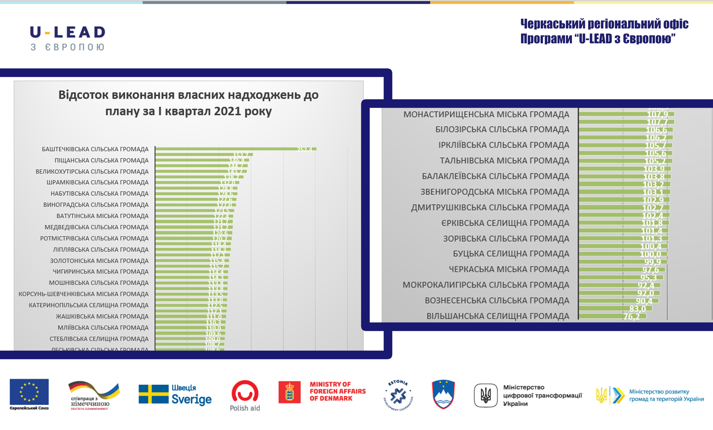 «Станом на 1 квітня 2021 року територіальні громади Черкаської області показали перевиконання розпису по власних доходах загального фонду на 4,8% (або на 76,0 млн. грн.) – при перевиконанні розпису по області в цілому на 5,5 % (або на 101,1 млн грн).