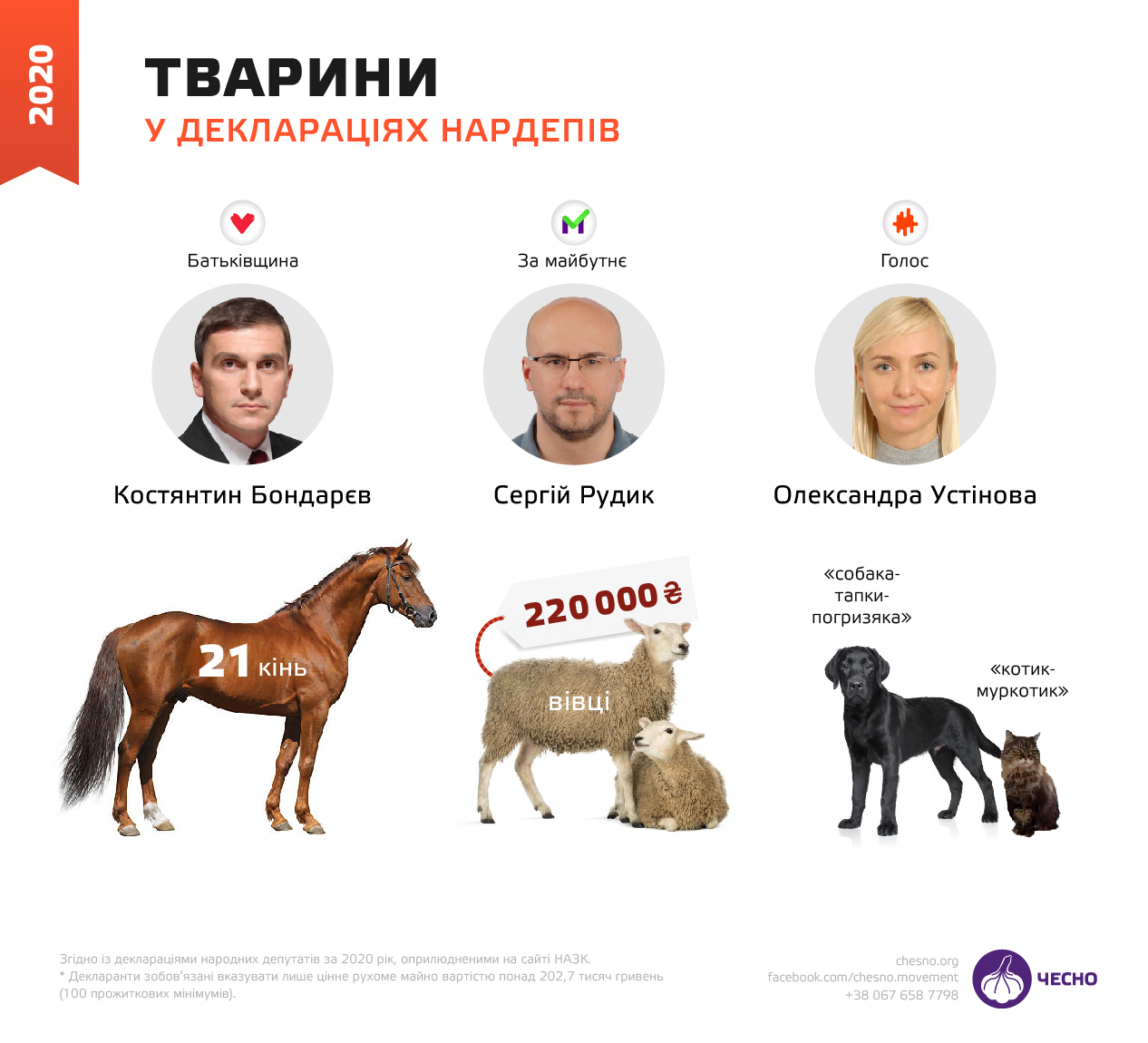 Нардеп Костянтин Бондарєв (“Батьківщина”) задекларував як свою власність 21 коня, а Сергій Рудик (“За майбутнє”) — овець сукупною вартістю 220 тис. гривень.