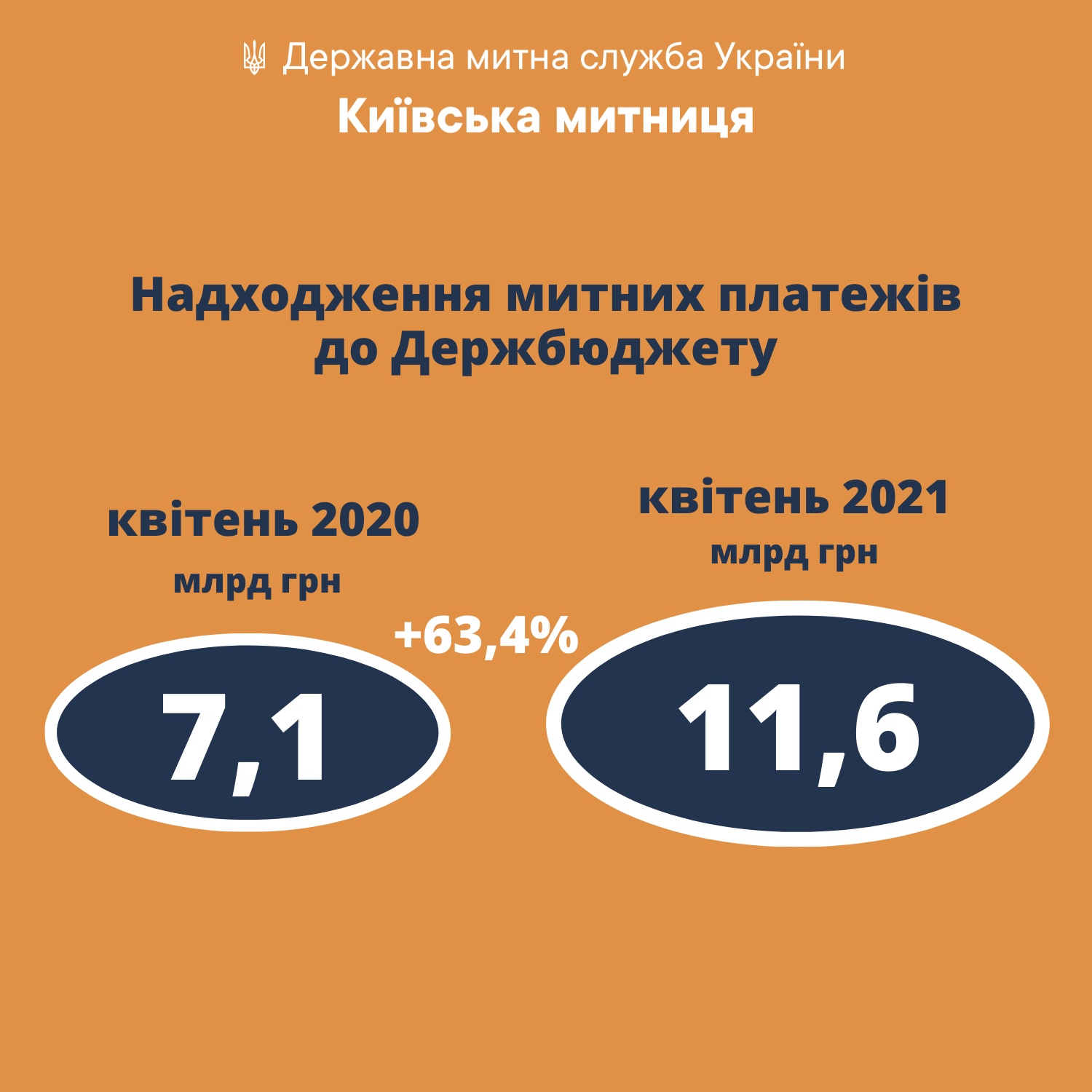 При цьому, у квітні 2021 року до квітня 2020 року надходження митних платежів збільшились на 4,5 млрд грн, або на 63,4% (квітень 2020 – 7,1 млрд грн).