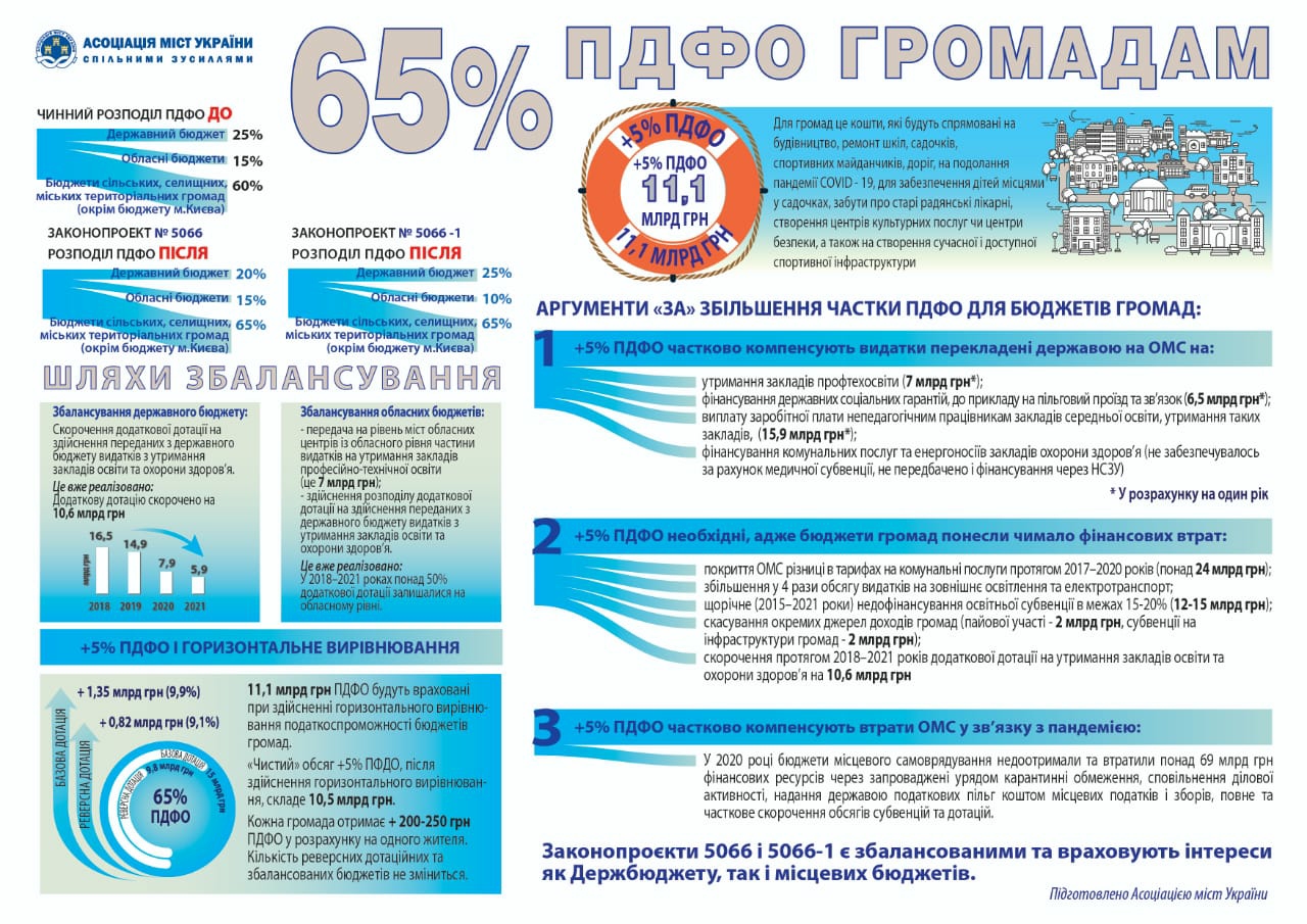 Збільшення відсотку зарахування ПДФО до бюджетів територіальних громад обумовлене гострою потребою компенсувати втрати громад від скасування окремих джерел формування бюджетів та від скорочення обсягу міжбюджетних трансфертів, а також необхідністю фінансово забезпечити видатки, що виникли у зв’язку із передачею від держави місцевому самоврядуванню додаткових повноважень. Обидва законопроєкти спрямовані на досягнення однієї мети – посилення фінансової спроможності територіальних громад та зміцнення матеріально-фінансової бази місцевого самоврядування. Для громад збільшення відсотку зарахування ПДФО із 60 до 65 відсотків – це отримання додаткового обсягу фінансового ресурсу в загальній сумі 11,1 млрд грн. За розрахунками Аналітичного центру АМУ збільшення відсотку зарахування ПДФО до бюджетів громад не змінить кількості бюджетів-донорів, збалансованих та дотаційних бюджетів. Обсяг додаткових 5% ПФДО для громад після здійснення горизонтального вирівнювання складе 10,5 млрд грн. Кожна громада отримає додатковий фінансовий ресурс у вигляді надходжень ПДФО.