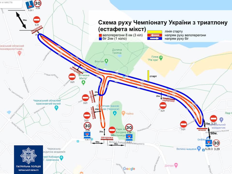 Відповідно до рішення виконавчого комітету Черкаської міської ради № 605 від 23.06.2021, 24 та 25 липня, рух транспортних засобів буде тимчасово заборонено з 7.30 до 14.00 на наступних ділянках: