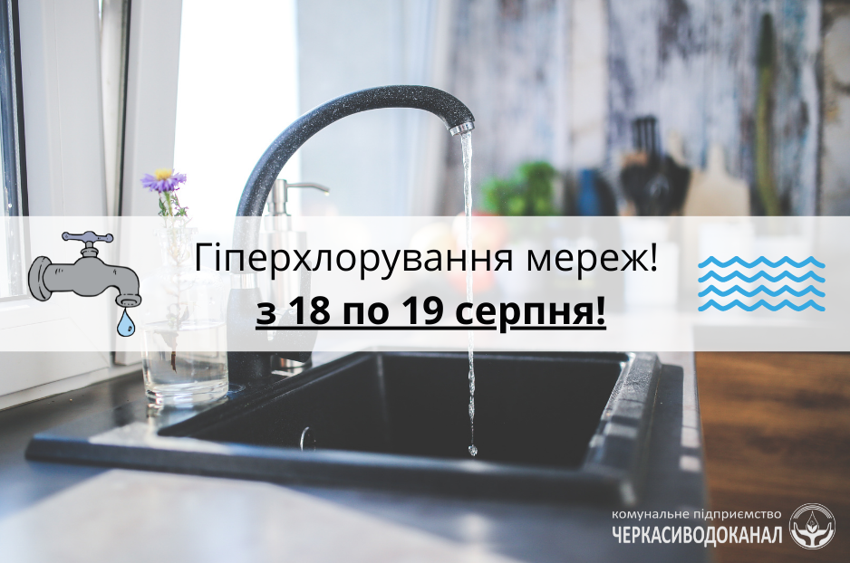 З метою запобігання негативної санітарно-епідеміологічної ситуації з 18 по 19 серпня в Черкасах буде проведена комплексна дезінфекція (гіперхлорування) об’єктів водопостачання: резервуарів чистої води, магістральних водогонів, розподільчих та внутрішньобудинкових мереж тощо. У цей період споживати воду заборонено, використовувати можна лише для технічних потреб.