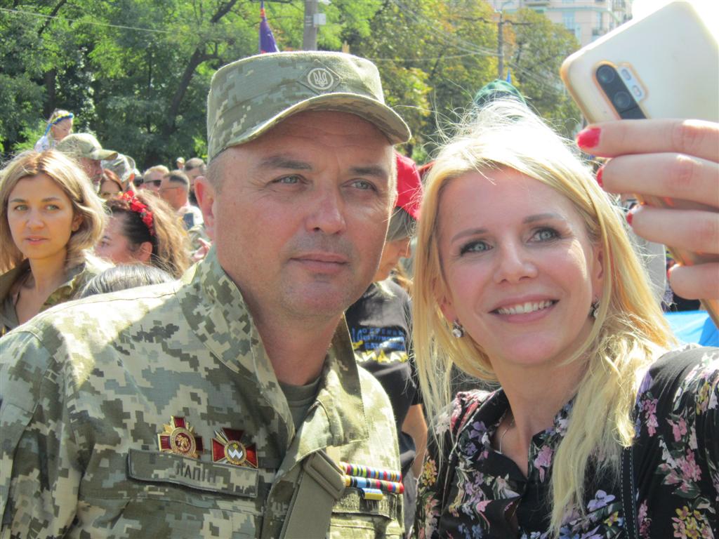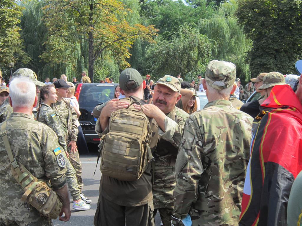 Я щасливий, що такого святого Дня, ще й у 30 річницю відновлення нашої самостійності, ветерани й волонтери Сміли запросили мене на Марш у столицю. На ньому я був з Олександром Парахневичем, Михайлом Мельничуком, Михайлом Семагіним, Олександром Галущенком, Миколою Плішем, Сергієм Федчишиним. До речі, Михайло Мельничук – батько капітана рейдового буксира „Яни Капу” Олега Мельничука, який уславився не лише вдалими маневрами буксира під час нападу військових кораблів РФ, а й тим, що в полоні, у підконтрольному Росії суді окупованого Криму, зумів наполягти на своєму праві на перекладача з іноземної російської мови. Зараз він знову на війні, а батько продовжує допомагати фронту. На Марш захисників Михайло Мельничук поїхав разом з дружиною Оксаною і донькою Аріною. Доньці лише 9 років. Та вона у спеку з цікавістю подолала весь чималий маршрут, на якому втомилися й деякі дядьки, і не ремствувала.