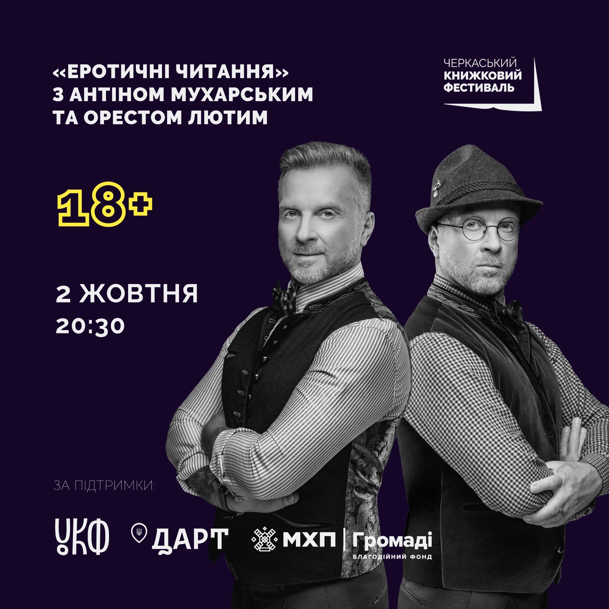 У межах Черкаського книжкового фестивалю 2 жовтня відбудеться незабутнє еротично-музичне дійство від неперевершеного майстра іронічної прози Антіна Мухарського та його мистецького побратима співочого антрополога Ореста Лютого.