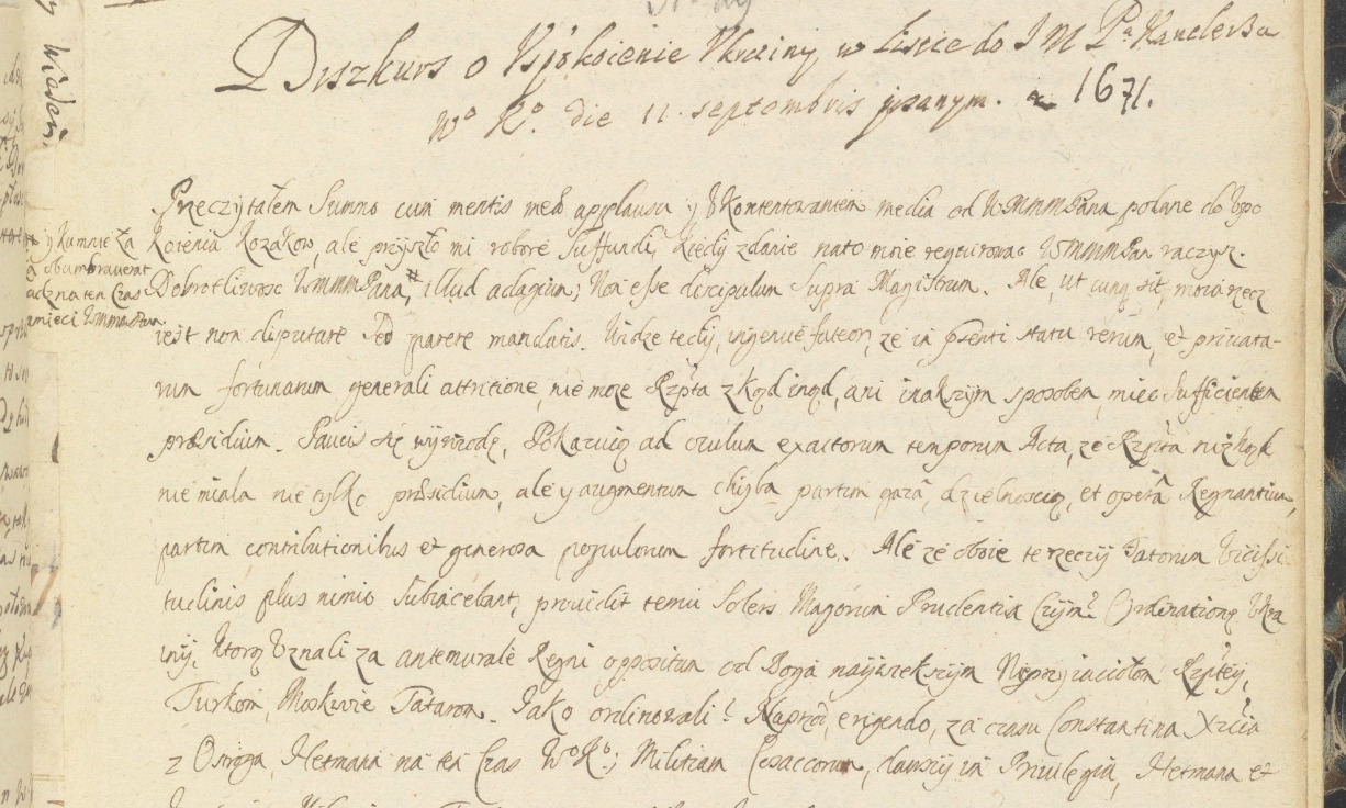Чим ще цікавий даний архівний документ? Та навіть самою назвою «Дискурс про заспокоєння України», яка виходить, що не припинила свою боротьбу за незалежність у 1654 році, а проводила її й до 1671 року! Автор-поляк пише. що Україна на чолі з козацтвом завжди була щитом і захистом для короля і Речі Посполитої, але підняла повстання проти них, чим і «накликала на себе Турків, Москву і Татар»…