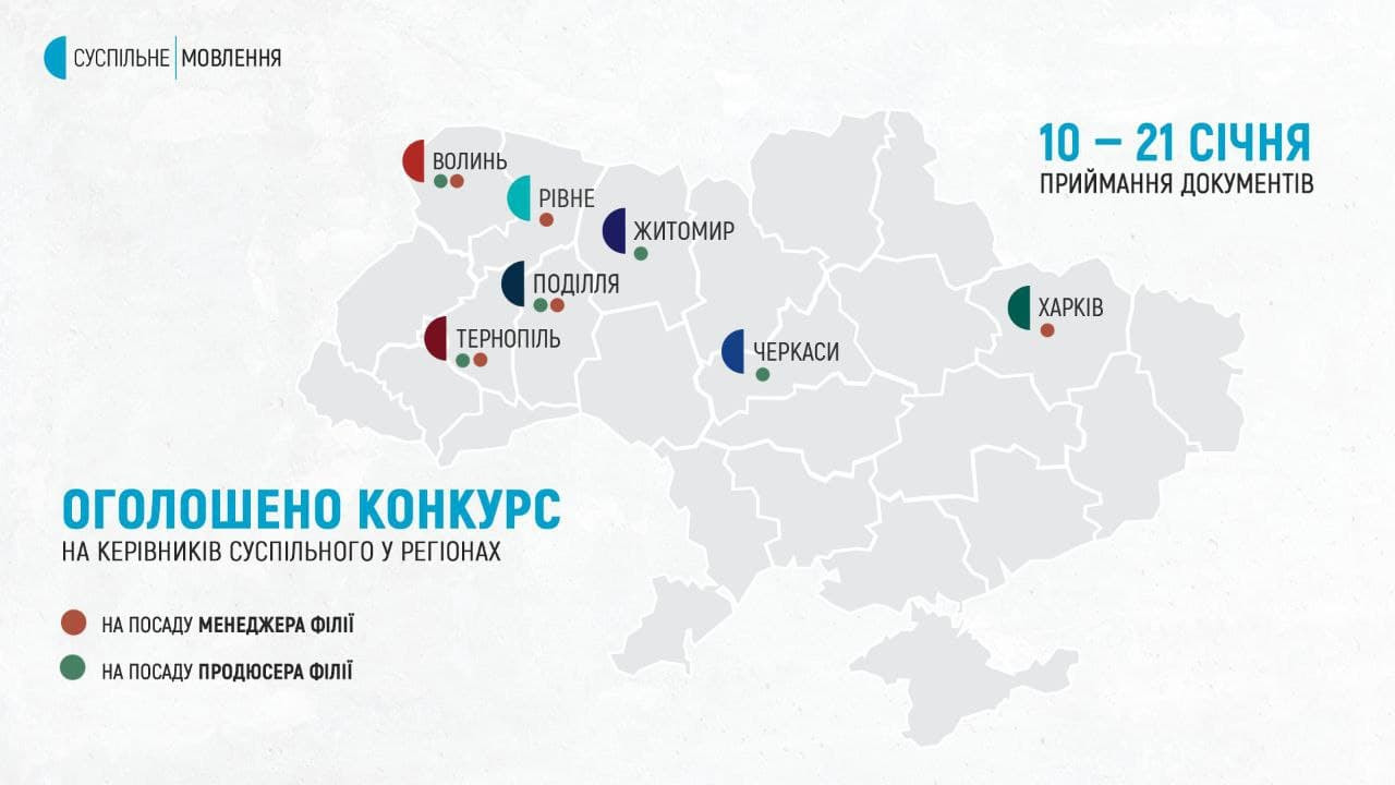 Нагадаємо, на Суспільному керівників регіональних філій не призначають, а обирають шляхом відкритого й незалежного конкурсу. Участь у конкурсі можуть узяти всі охочі, що відповідають кваліфікаційним вимогам. Функції адміністративного й творчого управління повністю поділено, відтак керівник творчого напряму роботи філії — продюсер, а всіма адміністративними та господарськими питаннями керує менеджер.Попередня хвиля планових конкурсів на керівні посади у регіонах відбулася восени 2021 року. В 10 регіонах обрали продюсерів, у 7 — менеджерів філій.